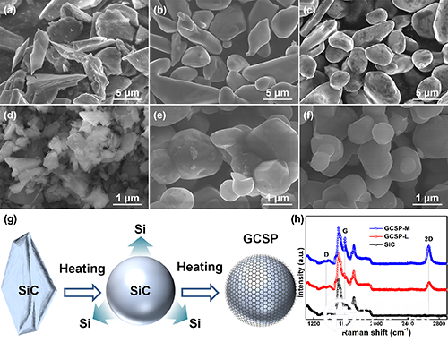 圖1. (a-c) 5 μm和 (d-f) 0.5 μm粒徑的原始SiC、GCSP-L(石墨烯1-3層)和GCSP-M(石墨烯4-9層)粉末的SEM形貌;(g)為原始SiC顆粒向GCSP衍化的示意圖;(h) 包覆兩種不同層數(shù)石墨烯/SiC顆粒的Raman譜。