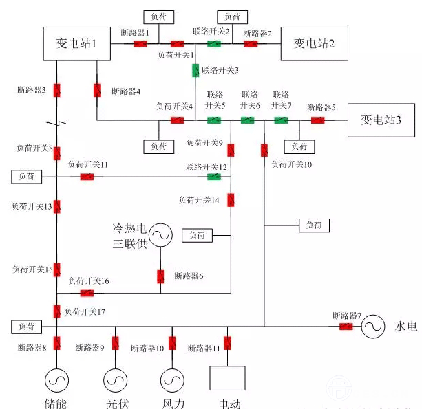 本文通過貴陽863示范區(qū)算例進行DIgSILENT仿真,具體算例示意如圖1所示。其中,故障點在聯絡開關3和負荷開關8之間,DER類型有儲能、光伏、風電、充電樁、水電和冷熱電三聯供等。