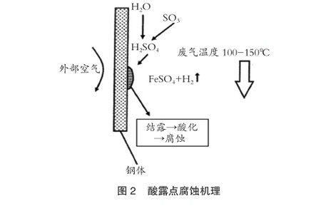 酸露點腐蝕機理,見 圖2。首先原料中的硫與燃料發(fā)生燃燒反應生成SO3,然后SO3與H2O發(fā)生反應生成H2SO4酸霧,最后當廢氣溫度降至酸露點以下時,H2SO4酸霧濃縮于廢氣處理系統(tǒng)管路內(nèi)的鋼體上,使H SO42-對管路內(nèi)的鋼體產(chǎn)生腐蝕。為了抑制腐蝕,必須要知道酸露點區(qū),可根據(jù)測得的廢氣中水分和SOx濃度由公式(1)來計算酸露點。酸露點條件:Ta>Tg。
