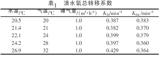 由表1 可見(jiàn),在曝氣量一定的條件下,清水中的氧總轉(zhuǎn)移系數(shù)隨水溫的升高而增大,但增幅不大?標(biāo)準(zhǔn)狀況下KLas的平均值為0.371 2 min-1?