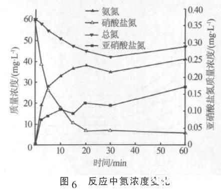 由圖6 可知,硝酸鹽氮去除率為92.8%,其中有64.4%轉(zhuǎn)化成氨氮,0.57%轉(zhuǎn)化成亞硝酸鹽氮, 可見(jiàn)硝酸鹽氮被還原后主要以氨氮形式存在?整個(gè)反應(yīng)中總氮呈現(xiàn)整體下降的趨勢(shì),損失的N 元素可能以N2的形式溢出,同時(shí)也有研究表明,生成物中存在有N2O?N2H4等氣態(tài)含氮化合物〔6〕?