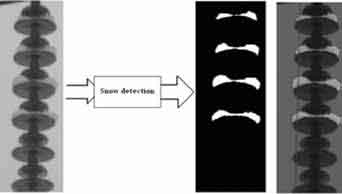 一旦成功截取ROI后探測(cè)冰雪并分 析覆蓋的程度絕緣子是剛性的其外形與尺寸是已知且固定的這意味 著覆冰或覆雪造成絕緣子外形的任 何變化將導(dǎo)致出現(xiàn)多余的邊緣通常 在上表面從圖像上確定雪或冰 的區(qū)域的方法有以下步驟