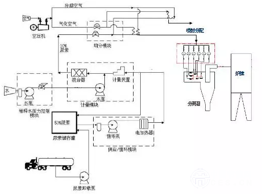 SNCR脫硝系統(tǒng)進(jìn)行模塊化設(shè)計(jì),主要由尿素溶液儲(chǔ)存與制備系統(tǒng)、稀釋和計(jì)量分配單元、噴射系統(tǒng)、自控系統(tǒng)所組成。