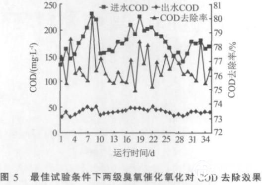 根據(jù)試驗用水的BOD5值可知,廢水經(jīng)過A/O+MBR 的生物降解作用, 已基本沒有生物降解性了,但其COD 仍很高,而且還含有一定的氨氮,很難滿足回用的要求,因此,需要一種有效的物化方法對其進行深度處理?根據(jù)廢水的特點并結(jié)合實驗室小試的研究結(jié)果,確定采用兩級臭氧深度催化氧化法對其進行處理,并取得了較好的處理效果?