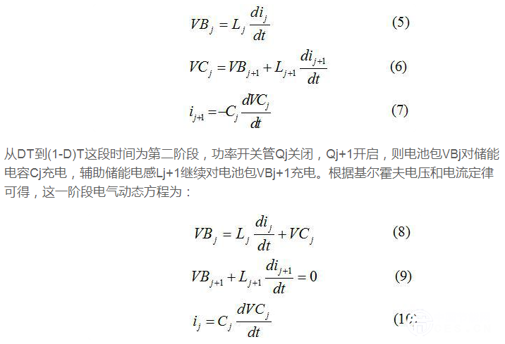 以j均衡模塊為對(duì)象進(jìn)行電路原理分析,定義D為PWM占空比,T為周期,初始狀態(tài)下儲(chǔ)能電容Cj電壓等于電池包VBj和VBj+1電壓之和。假設(shè)某一時(shí)刻電池包VBj電壓高于電池包VBj+1,忽略電池包等效內(nèi)阻和功率開關(guān)管阻抗,其電路分析過程如下:從零到DT這段時(shí)間為第一階段,功率開關(guān)管Qj開啟,Qj+1關(guān)閉,則電池包VBj對(duì)電感Lj充電,儲(chǔ)能電容Cj對(duì)電池包VBj+1和輔助儲(chǔ)能電感Lj+1充電。根據(jù)基爾霍夫電壓和電流定律可得,這一階段電氣動(dòng)態(tài)方程為: