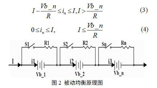 被動(dòng)均衡基本電路特征為將一個(gè)功率開關(guān)管和耗散電阻串聯(lián)后,再與電池包中的每個(gè)電池并聯(lián),通過“分流”需要均衡的電池電流,以此來控制各單體電池的均衡過程,具有電路結(jié)構(gòu)簡(jiǎn)單可靠、性價(jià)比高的優(yōu)點(diǎn)。被動(dòng)均衡電路原理圖如圖2所示,其中I為充電電流,Vb_n為各個(gè)單體電池電壓值,in為各個(gè)單體電池電流,Rn為耗散電阻,Sn為功率開關(guān)管。在動(dòng)力電池組充電過程中,若某單體電池電壓高于均衡閥值,則導(dǎo)通功率開關(guān)管,對(duì)該電池充電電流I進(jìn)行分流,從而使其充電速率比其它電池慢。忽略功率開關(guān)管的阻抗,則單體電池充電電流為: