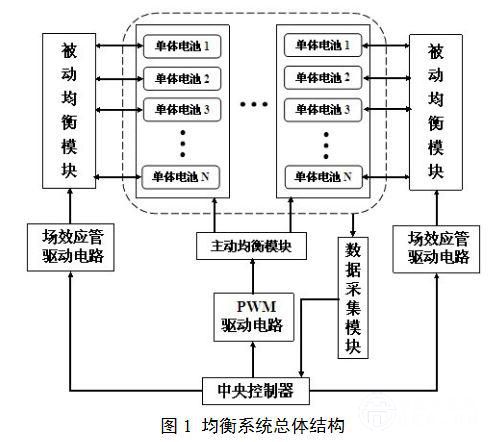 整個(gè)動(dòng)力電池組根據(jù)車輛動(dòng)力性需求可分為若干電池包,每個(gè)電池包由若干單體電池組成。本文設(shè)計(jì)的電池組能量均衡系統(tǒng)結(jié)構(gòu)如圖1所示,該均衡系統(tǒng)包含以下幾大功能模塊:數(shù)據(jù)采集模塊實(shí)時(shí)監(jiān)測(cè)電池組單體電池電壓信息,作為均衡電路是否工作的依據(jù)參數(shù);被動(dòng)均衡模塊作用于每個(gè)電池包內(nèi)單體電池之間,以各自電池包內(nèi)單體電池平均電壓為目標(biāo)參考值進(jìn)行動(dòng)態(tài)均衡,以此作為后續(xù)主動(dòng)均衡的基礎(chǔ);主動(dòng)均衡模塊作用于各個(gè)電池包之間,以被動(dòng)均衡后電池包平均電壓為目標(biāo)參考值進(jìn)行動(dòng)態(tài)雙向均衡;中央控制器根據(jù)數(shù)據(jù)采集模塊監(jiān)測(cè)到的電池電壓參數(shù),依據(jù)設(shè)置好的均衡策略,分別控制被動(dòng)均衡模塊和主動(dòng)均衡模塊的工作狀態(tài),其中被動(dòng)均衡模塊場(chǎng)效應(yīng)開關(guān)管由通用IO口輸出高低電平,經(jīng)由驅(qū)動(dòng)電路進(jìn)行控制,而主動(dòng)均衡模塊場(chǎng)效應(yīng)開關(guān)管由控制器相應(yīng)PWM模塊產(chǎn)生周期和占空比可控方波,經(jīng)由PWM驅(qū)動(dòng)電路進(jìn)行控制。