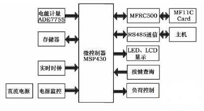微控制器采用TI公司的超低功耗單片機(jī)MSP430F427,它具有16kBFLASH和1kBRAM,自帶有128段LCD驅(qū)動(dòng)器。計(jì)量部分用ADI公司的專用電能計(jì)量滲片ADE7755。射頻讀寫接口芯片選用PHILIPS公司讀寫器專用芯片MFRC500,射頻卡選用低成本無源型MafareMF1卡。存儲(chǔ)部分采用E-PROM存儲(chǔ)器AT24LC16,實(shí)時(shí)時(shí)鐘采用MAXIM公司的帶溫度自動(dòng)補(bǔ)償?shù)腄S3231。鋰電池用于保證在電網(wǎng)斷電時(shí)電能表的n1常運(yùn)行。掉電監(jiān)測(cè)單兀采用MAX705實(shí)時(shí)監(jiān)控線性電源網(wǎng)絡(luò)的工作情況。負(fù)荷控制部分采用上海貝斯特公司的BST-902-(50)A型磁保持繼電器控制負(fù)載的通斷。電能表與卜位機(jī)的信息交互采用近紅外光電通信和遠(yuǎn)程HS485總線方式。電能表采用按鍵實(shí)現(xiàn)關(guān)鍵信息的杳詢。