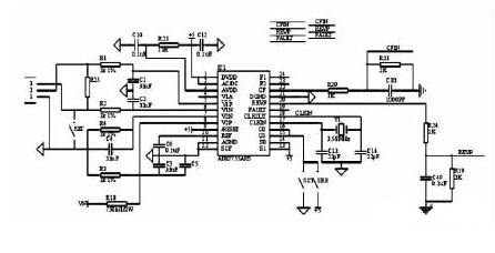 ADE7755的計(jì)量電路如圖2所示。電壓通過電阻分壓網(wǎng)絡(luò)后連接到ADE7755取樣的電壓計(jì)量通道,電流通過錳銅片后送入ADE7755的電流計(jì)量通道,ADE7755的線性度為1‰,保證了計(jì)量的準(zhǔn)確性。CF頻率輸出端經(jīng)過外接濾波電路與MCU的IO口連接。ADE7755設(shè)定了一個(gè)最小輸出頻率,當(dāng)負(fù)載產(chǎn)生的輸出頻率低于這個(gè)規(guī)定的最小輸出頻率,F(xiàn)1、F2和CF將不會(huì)輸出任何脈沖,這個(gè)頻率是滿量程輸出頻率對(duì)應(yīng)的F1-4的0.0014%。電能表的脈沖常數(shù)是1600imp/kWh,最大負(fù)載電流是40A,最合適的F1-4頻率為13.6Hz,即S0=1,S1=1,SCF=0。