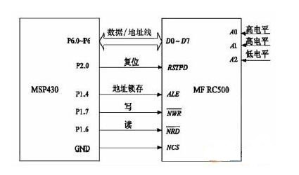 圖3MFRC500芯片與MSP430的連接簡(jiǎn)圖