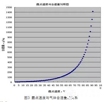 上世紀(jì)70年代煉鐵設(shè)計(jì)資料手冊(cè)就有關(guān)于大氣濕度與結(jié)露溫度關(guān)系的介紹,將其制成圖3??蓪t頂煤氣中含濕量算出與對(duì)應(yīng)的露點(diǎn)溫度查表得出,此時(shí)的露點(diǎn)溫度就是允許煤氣回收溫度,筆者簡(jiǎn)易計(jì)算表明,爐頂溫度大于30 0C可回收煤氣,且有多次實(shí)踐。