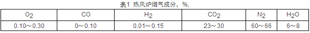 熱風(fēng)爐煙道廢氣完全可做為噴吹煤粉的惰性氣體和載氣,其成份見(jiàn)表1,它是兩種惰性氣體的混合氣。改當(dāng)前加壓空氣或N2作為噴煤載氣為加壓煙道廢氣作為噴煤載氣,吸入口稍增加簡(jiǎn)單除塵和脫水設(shè)施即可應(yīng)用,其惰化效果應(yīng)比純N2還好。