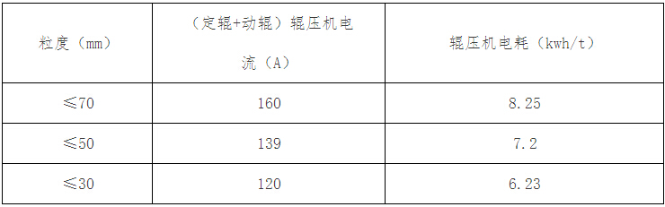 粒度減小,輥壓機(jī)單電耗降低,石灰石破碎機(jī)電耗能增加多少?課題組經(jīng)過認(rèn)真分析:認(rèn)為影響破碎機(jī)單電耗的主要因素是采礦時爆破粒度的大小和破碎機(jī)工作時倒料車的進(jìn)料連續(xù)性。實際上粒度控制在小于等于70mm時,雖然破碎機(jī)產(chǎn)量增加,但由于運距及倒料人員的責(zé)任心等原因造成供料的不及時,破碎機(jī)空載時間延長,產(chǎn)量的增加對破碎機(jī)單電耗的影響并不明顯。只要控制好爆破粒度,粒度小于等于30mm工作時,由于產(chǎn)量下降,破碎機(jī)空轉(zhuǎn)時間減少,效率的提高基本可以抵消由于粒度減少帶來的單電耗上升,可對破碎機(jī)單電耗的增加忽略不計;入輥粒度大時輥壓機(jī)運行電流高、產(chǎn)量下降,入輥粒度小時輥壓機(jī)運行電流低、產(chǎn)量會增加。為此,我們確定了繼續(xù)減小入輥壓機(jī)物料粒度的方案,將破碎機(jī)出料粒度調(diào)整為輥壓機(jī)造成運行時輥縫波動的下限,即由小于等于50mm調(diào)整為小于等于30mm。調(diào)整后,輥壓機(jī)單耗下降1.0 KWh/t.兩次調(diào)整破碎機(jī)出料粒度,輥壓機(jī)單耗下降2.05KWh/t。在臺產(chǎn)為每小時300噸時不同粒度對輥壓機(jī)單電耗的影響見下表: