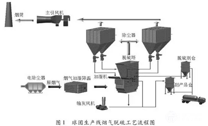 工作原理:脫硫除塵一體化的密相塔半干法脫硫技術(shù)是一種以鈣基脫硫劑 CaO 為主的增濕類煙氣脫硫技術(shù),細粉狀脫硫劑在加濕混合器內(nèi)加濕混合,水均勻分配到顆粒表面,加濕后的脫硫劑與 SO 2 在脫硫塔內(nèi)進行脫硫反應。球團煙氣脫硫工藝流程如圖 1 所示。