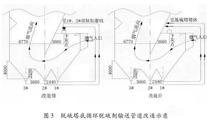 為此,對塔底循環(huán)脫硫劑輸送管道進行了改造,將塔底水分含量高的循環(huán)脫硫劑用氣力輸送至脫硫塔,進入脫硫塔的點位就選在雙軸攪拌加濕機上方的脫硫塔壁處。同時,將除塵器1 # 、2 # 反吹頻次提高1. 5 倍,灰斗下方的給料量也提高近1. 5 倍,在雙軸攪拌加濕機灰量不變的情況下,加濕水量也相應提高了40% 以上,2 臺雙軸的加水量由0. 7 ~0. 8 t/h 均提高至1. 2~1. 3 t/h,加濕水總量由 2. 0 ~ 2. 2 t/h 提高至3. 0 ~3. 2 t/h,并對 # 、2 # 雙軸攪拌加濕機的 2臺水泵進行增容改造來滿足脫硫系統(tǒng)對水量的需求。輸灰管道改造后,相應提高了循環(huán)脫硫劑的循環(huán)倍率,直接提高了脫硫塔內(nèi)的脫硫劑濃度含量,使脫硫系統(tǒng)的脫硫效率得到了大幅改善。改造前后脫硫系統(tǒng)加水量及脫硫效果對比見表4 與表5,脫硫塔底循環(huán)脫硫劑輸送管道改造示意如圖3。