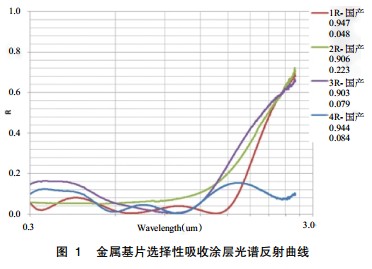 測試太陽吸收比,采用日本島津紫外—可見光—近紅外分光光度計,型號UV-UI-NIR3101PC,測量波長范圍300nm~2600nm.測量鍍膜玻璃膜面的太陽反射譜R(λ),通過積分公式計算得出鍍膜樣片吸收比。紅外法向發(fā)射比測試,采用國產(chǎn)紅外分光光度計,測量波長范圍2.5μm~25μm.圖1給出測試得到的幾種金屬基片太陽選擇性吸收涂層光譜反射曲線。因所得到的5R-國產(chǎn)銅基片磁控濺射藍膜涂層表面進行了軋花加工,未進行光學(xué)性能測試。