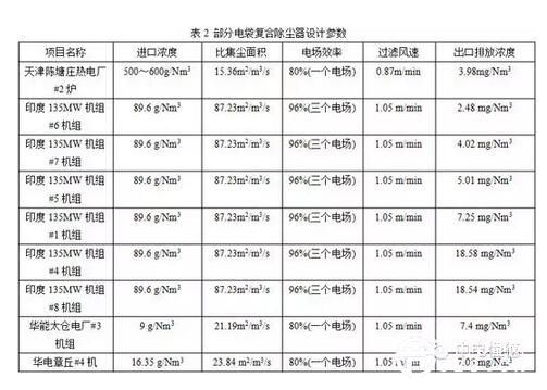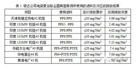 濾袋是電袋復(fù)合除塵器的核心部件之一。為了使電袋復(fù)合除塵器能高效除塵,濾料的選擇至關(guān)重要。濾料粉塵泄漏則直接影響電袋復(fù)合除塵器的除塵效率,而造成濾料粉塵泄漏有幾個方面的原因,首先為濾袋本身原因:如過濾精度不高、中縫縫線處的針孔過大;其次為機(jī)械安裝原因:花板與殼體焊接密封性不好、旁路風(fēng)門關(guān)閉不嚴(yán)等。因此要達(dá)到低排放首先應(yīng)把握好濾袋的制作質(zhì)量問題。菲達(dá)公司對幾個低排放的電袋復(fù)合除塵器典型案例的使用濾料進(jìn)行了統(tǒng)計(jì),其結(jié)果如下表1: