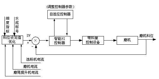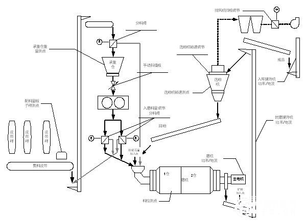 采用的控制包括:承重倉物料量控制、入磨物料量控制、料位控制、循環(huán)負(fù)荷控制。其中循環(huán)負(fù)荷控制為微量控制,承重倉物料量控制為定范圍調(diào)節(jié)(在范圍內(nèi)不調(diào)節(jié),超出一定量后調(diào)節(jié)),磨機(jī)料位控制為實(shí)時(shí)調(diào)節(jié)。擬采集過程參數(shù)包括:承重倉重量(或料位)信號(hào)、磨機(jī)料位信號(hào)、磨機(jī)電流(或功率)信號(hào)、入磨物料量、出磨提升機(jī)電流信號(hào)、選粉機(jī)轉(zhuǎn)速信號(hào)、水泥入庫提升機(jī)電流信號(hào)??刂泣c(diǎn)包括:分料閥開度、選粉機(jī)轉(zhuǎn)速等。