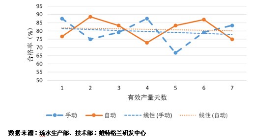 圖10為同一時(shí)間段手/自動(dòng)運(yùn)行的比表合格率折線圖:對(duì)比可見,自動(dòng)運(yùn)行質(zhì)量水平與手動(dòng)操作相當(dāng),但總體趨勢(shì)相對(duì)穩(wěn)定,即質(zhì)量合格率較為穩(wěn)定。