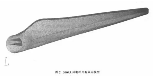 建立DF64A葉片疲勞損傷計算的葉片有限元模型.有限元網(wǎng)格劃分如圖2所示。最終的計算模型需要對葉片有限元模型進(jìn)行復(fù)合材料鋪層.并在葉根處施加固定支撐約束模擬葉片的工作狀況。