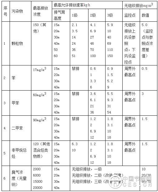 執(zhí)行GB16927-1996《大氣污染物綜合排放標(biāo)準(zhǔn)》。苯、甲苯、二甲苯和非甲烷總烴及過(guò)噴漆霧(顆粒物)等的排放量要達(dá)到其限值要求。