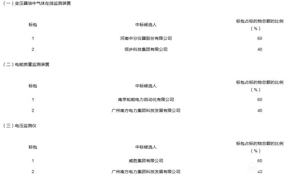 廣東電網(wǎng)有限責(zé)任公司2016年變壓器油中氣體在線監(jiān)測裝置、電能質(zhì)量監(jiān)測裝置、電壓監(jiān)測儀框架招標(biāo)評標(biāo)工作已結(jié)束。按照招標(biāo)方案、招標(biāo)文件的要求,現(xiàn)將推薦中標(biāo)結(jié)果公示如下: