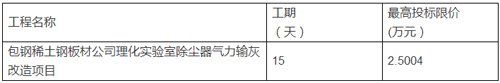 包鋼稀土鋼板材公司理化實驗室除塵器氣力輸灰改造項目,具體內(nèi)容及工程范圍詳見招標文件。