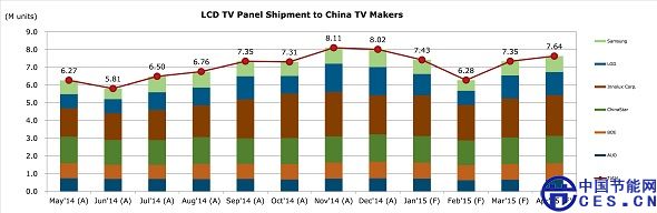 根據(jù)IHS DisplaySearch最新的月度LCD市場動態(tài)報告調(diào)查顯示,2014年12月出貨至中國廠商液晶電視面板數(shù)量與前一個月略微下降1%,低于預(yù)期5個百分點。群創(chuàng)依然為中國大陸廠商最大面板供應(yīng)商,緊隨其后為LG Display和華星。由于中國廠商對液晶電視面板的強勁需求,2014年全年液晶電視面板采購量大幅增長21%。