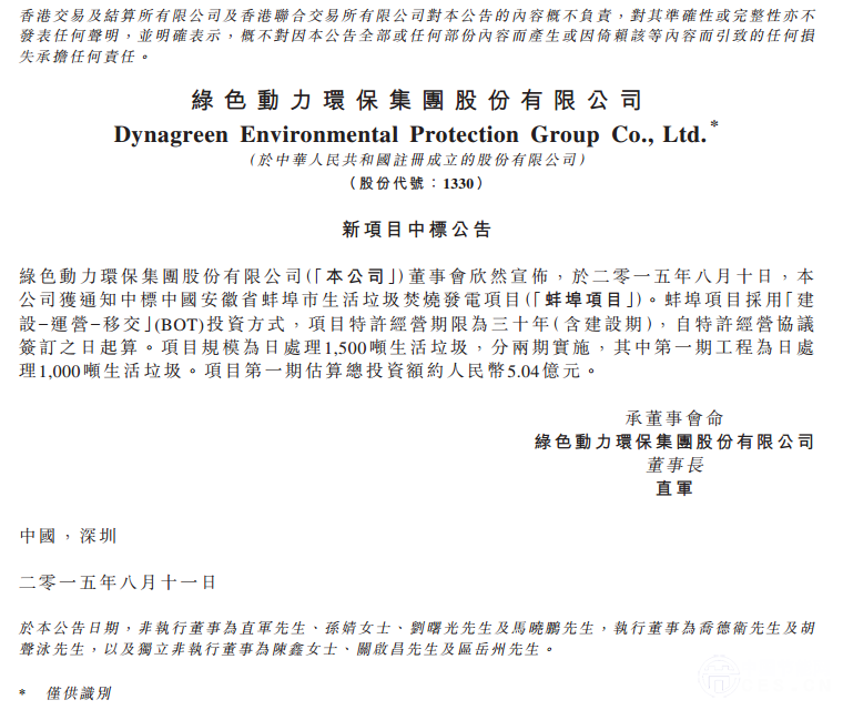 綠色動(dòng)力環(huán)保公布,昨日獲通知中標(biāo)中國(guó)安徽省蚌埠市生活垃圾焚燒發(fā)電項(xiàng)目,該蚌埠項(xiàng)目采用“建設(shè)–運(yùn)營(yíng)–移交”(BOT)投資方式,項(xiàng)目特許經(jīng)營(yíng)期限為30年,自特許經(jīng)營(yíng)協(xié)議簽訂之日起算。項(xiàng)目規(guī)模為日處理1500噸生活垃圾,分兩期實(shí)施,其中第一期工程為日處理1000噸生活垃圾。項(xiàng)目第一期估算總投資額約5.04億元人民幣。