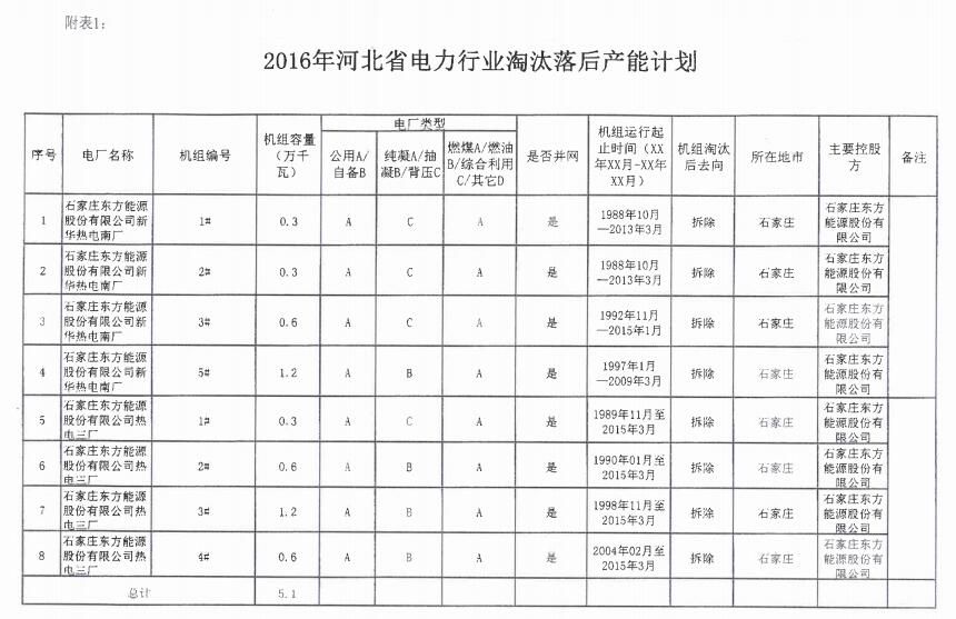 在確保供電、供熱的基礎(chǔ)上,2016年初步安排淘汰電力行業(yè)落后產(chǎn)能5.1萬千瓦(附表1)。列入淘汰落后產(chǎn)能目標任務(wù)的機組要按照國家能源局有關(guān)要求實施破壞性拆除。