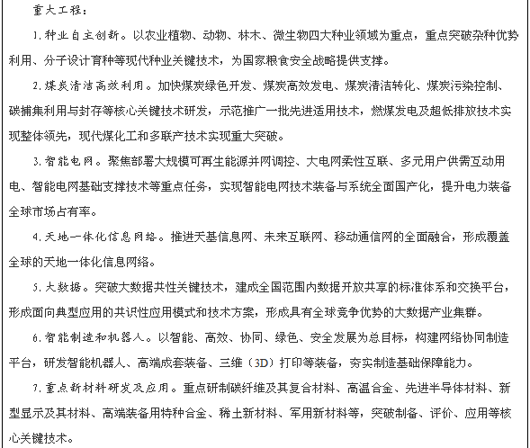 面向2030年,再選擇一批體現(xiàn)國家戰(zhàn)略意圖的重大科技項目,力爭有所突破。從更長遠(yuǎn)的戰(zhàn)略需求出發(fā),堅持有所為、有所不為,力爭在航空發(fā)動機及燃?xì)廨啓C、深??臻g站、量子通信與量子計算、腦科學(xué)與類腦研究、國家網(wǎng)絡(luò)空間安全、深空探測及空間飛行器在軌服務(wù)與維護系統(tǒng)、種業(yè)自主創(chuàng)新、煤炭清潔高效利用、智能電網(wǎng)、天地一體化信息網(wǎng)絡(luò)、大數(shù)據(jù)、智能制造和機器人、重點新材料研發(fā)及應(yīng)用、京津冀環(huán)境綜合治理、健康保障等重點方向率先突破。按照“成熟一項、啟動一項”的原則,分批次有序啟動實施。