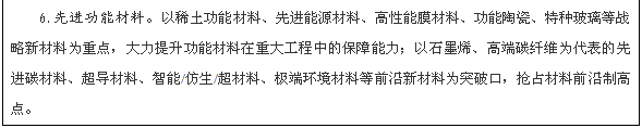 圍繞重點基礎(chǔ)產(chǎn)業(yè)、戰(zhàn)略性新興產(chǎn)業(yè)和國防建設(shè)對新材料的重大需求,加快新材料技術(shù)突破和應(yīng)用。發(fā)展先進(jìn)結(jié)構(gòu)材料技術(shù),重點是高溫合金、高品質(zhì)特殊鋼、先進(jìn)輕合金、特種工程塑料、高性能纖維及復(fù)合材料、特種玻璃與陶瓷等技術(shù)及應(yīng)用。發(fā)展先進(jìn)功能材料技術(shù),重點是第三代半導(dǎo)體材料、納米材料、新能源材料、印刷顯示與激光顯示材料、智能/仿生/超材料、高溫超導(dǎo)材料、稀土新材料、膜分離材料、新型生物醫(yī)用材料、生態(tài)環(huán)境材料等技術(shù)及應(yīng)用。發(fā)展變革性的材料研發(fā)與綠色制造新技術(shù),重點是材料基因工程關(guān)鍵技術(shù)與支撐平臺,短流程、近終形、高能效、低排放為特征的材料綠色制造技術(shù)及工程應(yīng)用。