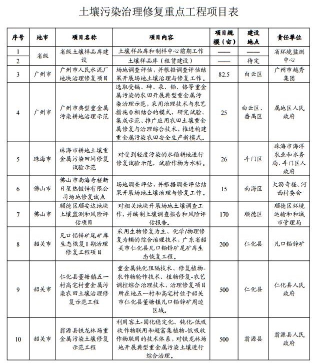 試點示范:廣州、珠海、佛山、中山市和汕頭市潮陽區(qū)、清遠市佛岡縣以及韶關市翁源、仁化縣等地于2017年底前各開展1項以上受污染耕地治理與修復試點示范工程。自2017年起,各地根據(jù)實際需要,適時開展工業(yè)污染地塊試點示范。