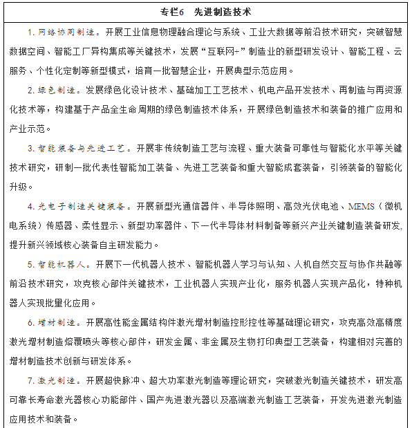 圍繞建設(shè)制造強(qiáng)國(guó),大力推進(jìn)制造業(yè)向智能化、綠色化、服務(wù)化方向發(fā)展。發(fā)展網(wǎng)絡(luò)協(xié)同制造技術(shù),重點(diǎn)研究基于“互聯(lián)網(wǎng)+”的創(chuàng)新設(shè)計(jì)、基于物聯(lián)網(wǎng)的智能工廠、制造資源集成管控、全生命周期制造服務(wù)等關(guān)鍵技術(shù);發(fā)展綠色制造技術(shù)與產(chǎn)品,重點(diǎn)研究再設(shè)計(jì)、再制造與再資源化等關(guān)鍵技術(shù),推動(dòng)制造業(yè)生產(chǎn)模式和產(chǎn)業(yè)形態(tài)創(chuàng)新。發(fā)展機(jī)器人、智能感知、智能控制、微納制造、復(fù)雜制造系統(tǒng)等關(guān)鍵技術(shù),開發(fā)重大智能成套裝備、光電子制造裝備、智能機(jī)器人、增材制造、激光制造等關(guān)鍵裝備與工藝,推進(jìn)制造業(yè)智能化發(fā)展。開展設(shè)計(jì)技術(shù)、可靠性技術(shù)、制造工藝、關(guān)鍵基礎(chǔ)件、工業(yè)傳感器、智能儀器儀表、基礎(chǔ)數(shù)據(jù)庫(kù)、工業(yè)試驗(yàn)平臺(tái)等制造基礎(chǔ)共性技術(shù)研發(fā),提升制造基礎(chǔ)能力。推動(dòng)制造業(yè)信息化服務(wù)增效,加強(qiáng)制造裝備及產(chǎn)品“數(shù)控一代”創(chuàng)新應(yīng)用示范,提高制造業(yè)信息化和自動(dòng)化水平,支撐傳統(tǒng)制造業(yè)轉(zhuǎn)型升級(jí)。