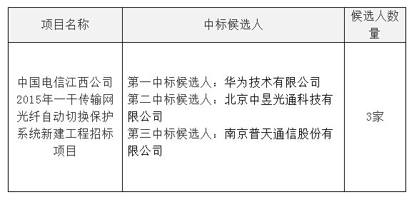 昨天,官方公布中國(guó)電信江西公司2015年一干傳輸網(wǎng)光纖自動(dòng)切換保護(hù)系統(tǒng)新建工程招標(biāo)項(xiàng)目中標(biāo)候選人,其中,華為、北京中昱光通、南京普天分別為第一、二、三中標(biāo)候選人。具體信息如下: