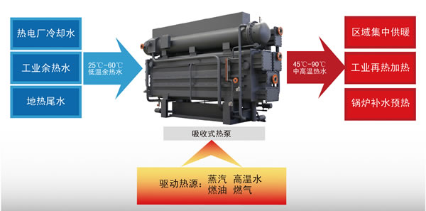 ±在熱電、冶煉(鋼鐵、有色金屬)、石化(石油、化工)、紡織等行業(yè),利用25~60℃左右的低溫余熱水,通過少量高品位熱能驅(qū)動,制取45~90℃中高溫?zé)崴?,供區(qū)域集中供熱、工業(yè)再熱加熱、鍋爐補水預(yù)熱。