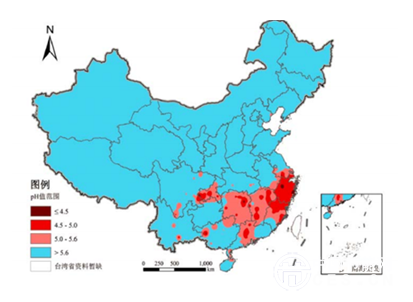 2014 年,470 個(gè)監(jiān)測降水的城市(區(qū)、縣)中,酸雨頻率均值為 17.4%。出現(xiàn)酸雨的城市比例為44.3%,酸雨頻率在25%以上的城市比例為26.6%,酸雨頻率在 75%以上的城市比例為9.1%。2014 年,酸雨污染主要分布在長江以南-青藏高原以東地區(qū),主要包括浙江、江西、福建、湖南、重慶的大部分地區(qū),以及長三角、珠三角地區(qū)。2014 年全國降水pH年均值等值線分布示意圖如下: