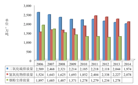 2006 年以來呈下降趨勢,2014 年二氧化硫排放量比 2006 年下降約 23.73%。其中電力行業(yè)是二氧化硫主要排放源, 鋼鐵企業(yè)和工業(yè)鍋爐也是重要的二氧化硫污染源。2006~2014 年我國大氣主要污染物排放情況如下圖: