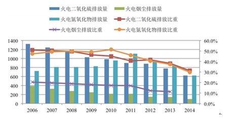 2014 年我國火電煙塵排放量為 98 萬噸,較 2013 年減少 44 萬噸,減排31.0%3。2006~2014 年我國火電主要污染排放情況如下所示: