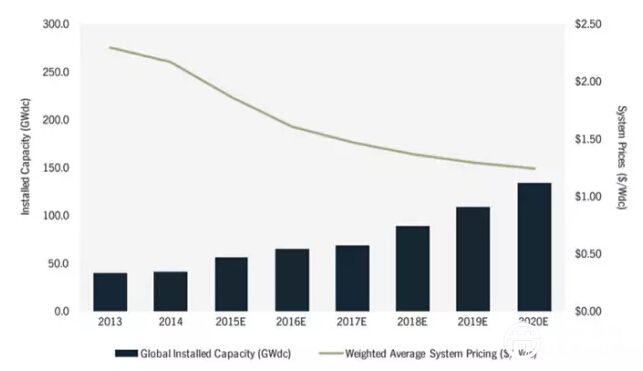 盡管光伏板的價格穩(wěn)步下降,總成本下降的主要驅(qū)動已轉(zhuǎn)向系統(tǒng)平衡成本,包括組件以外的其他設備、安裝以及營銷等費用。2015年,該部分占總成本的55%。下圖展示了到2020年預期成本和裝機容量的數(shù)字。