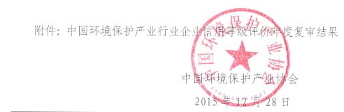 公示期間,如對復審結果有異議,請于2016年1月11日前將書面意見反饋至中國環(huán)境保護產(chǎn)業(yè)協(xié)會信用評價辦公室。