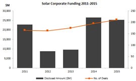 太陽能行業(yè)全球企業(yè)融資,包括上市公司籌集的創(chuàng)業(yè)投資/私募股權(quán)投資(VC)、債務(wù)融資和公開市場(chǎng)融資總共達(dá)253億美元,2014年為265億美元。