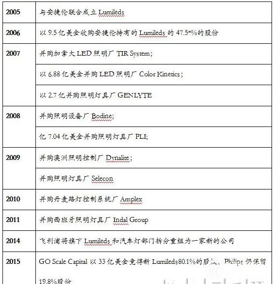 也因此,飛利浦需要通過(guò)后向一體化Lumileds,內(nèi)部化供應(yīng)鏈,更重要的是掌握LED市場(chǎng)變革的脈動(dòng),提前在LED普及化之前,領(lǐng)先布局技術(shù),專利及標(biāo)準(zhǔn),這些都不是靠市場(chǎng)可以獲取的。除開(kāi)Lumileds,當(dāng)時(shí)飛利浦有一系列的收購(gòu)動(dòng)作來(lái)支撐其縱向一體化戰(zhàn)略。