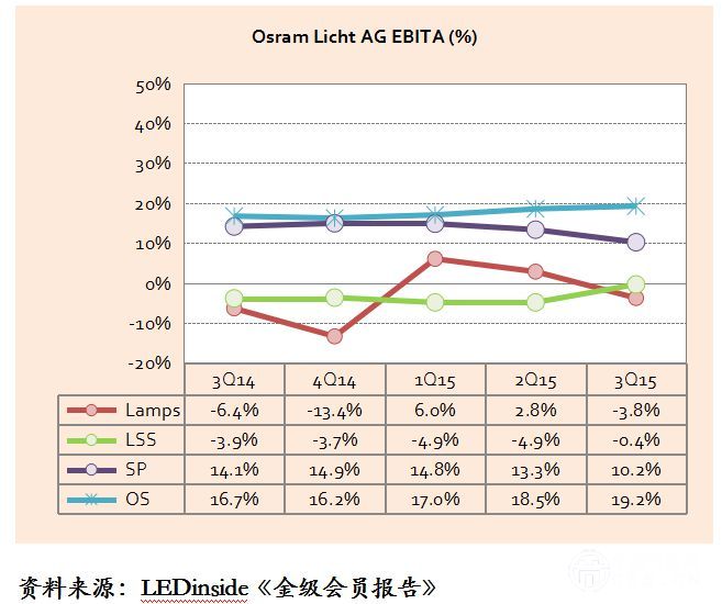 實(shí)際上,觀察過(guò)去幾年OSRAM的產(chǎn)品收入結(jié)構(gòu)就會(huì)發(fā)現(xiàn),在全球LED照明迅速替換掉傳統(tǒng)的光源的時(shí)候,OSRAM雖然也有向LED照明轉(zhuǎn)進(jìn)的意愿,但是OSRAM的LED部門主要定位中高端,能夠提供的支持實(shí)在太有限,完全無(wú)法應(yīng)對(duì)亞洲廠商的低價(jià)化浪潮。即使是同為跨國(guó)品牌的Philips在LED替換浪潮中也比OSRAM靈活了許多,不僅利用全球品牌和通路的優(yōu)勢(shì)在全球市場(chǎng)上牢牢占據(jù)出??冢浅浞掷弥袊?guó)的供應(yīng)鏈的成本優(yōu)勢(shì),保住全球領(lǐng)導(dǎo)性地位。而OSRAM顯然是這場(chǎng)變革中的被逆襲者,就在過(guò)去的數(shù)個(gè)季度,LAMPS以及照明系統(tǒng)(LSS)產(chǎn)品EBITA多次出現(xiàn)負(fù)值,近3個(gè)季度更出現(xiàn)連續(xù)下滑的趨勢(shì)。