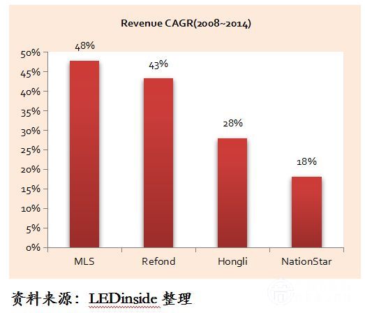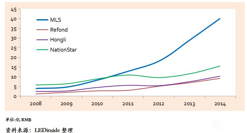 與差不多同時(shí)期興起的幾家中國(guó)封裝廠如國(guó)星,瑞豐,鴻利相比,木林森的成長(zhǎng)速度驚人,2008年之前彼此的相差還不甚大,然而到2014年,收入規(guī)模差不多拉開(kāi)了3~4倍的距離。
