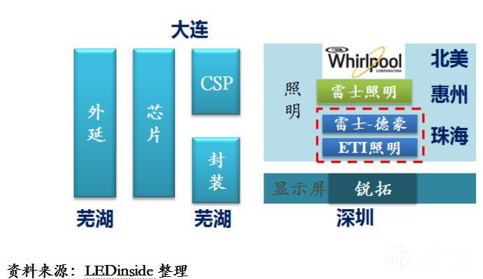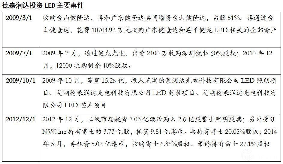 通常討論LED行業(yè)的經(jīng)典商業(yè)模式,飛利浦和OSRAM兩大巨頭都從產(chǎn)業(yè)最上游的LED芯片做到最下游的應(yīng)用產(chǎn)品,是LED行業(yè)教科書式的縱向一體化代表。中國(guó)廠商中,雖然多數(shù)企業(yè)都采取了專業(yè)化分工的模式參與LED產(chǎn)業(yè)鏈,但其中也有德豪潤(rùn)達(dá)奉縱向一體化戰(zhàn)略為圭臬,從2009年并購(gòu)健隆達(dá)進(jìn)入LED行業(yè)開(kāi)始,便通過(guò)一些列的投資和并購(gòu)逐漸補(bǔ)齊全產(chǎn)業(yè)鏈,擁有了從芯片到封裝到應(yīng)用再到照明品牌的完整產(chǎn)業(yè)鏈環(huán)節(jié)。