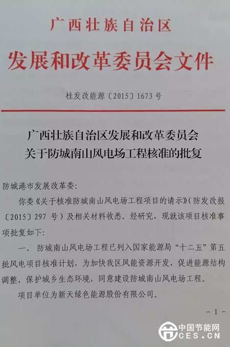新天綠色能源公司廣西防城南山風(fēng)電場(chǎng)工程喜獲核準(zhǔn)