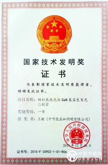 由中國節(jié)能環(huán)保集團旗下中節(jié)能晶和照明有限公司參與完成的“硅襯底高光效氮化鎵基藍色發(fā)光二極管項目”,在1月8日召開的2015年度國家科學技術獎勵大會上,獲得國家技術發(fā)明一等獎。該項目由中節(jié)能晶和照明有限公司、南昌大學、晶能光電(江西)有限公司共同完成。項目主要完成人包括晶能光電聯合創(chuàng)始人、南昌大學副校長江風益教授,晶能光電副總裁孫錢博士,晶能光電聯合創(chuàng)始人、CEO及晶和照明創(chuàng)始人王敏博士等人。
