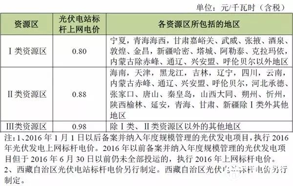 根據(jù)各地太陽(yáng)能資源條件和建設(shè)成本,將全國(guó)分為三類太陽(yáng)能資源區(qū),自2016年起逐步下調(diào)光伏電站標(biāo)桿上網(wǎng)電價(jià)。