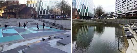 暴雨時,水廣場可以充當蓄水設(shè)施,防止城市街道形成內(nèi)澇。在無雨期,水廣場可以成為公共活動場地。鹿特丹水廣場由當?shù)匾患覍iT從事水相關(guān)的可持續(xù)城市建設(shè)的建筑公司DeUrbanisten進行設(shè)計建造。水廣場由體育場和山形運動場兩部分組成:體育場是處于地下一米的位置,周圍是可以作為觀眾看臺的臺階;山形運動場由多大個處于不同高度的地面空間組成,可以供人們休息玩耍。體育場和運動場的連接地段種植了綠樹和花草。在降雨較少的月份,水廣場大部分時間被當作休閑場地來使用。只有在暴雨時,水廣場會變身為雨水收集設(shè)施。